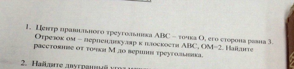 Так как ОА=ОВ=ОС, то МА=МВ=МС=кореньиз(7).