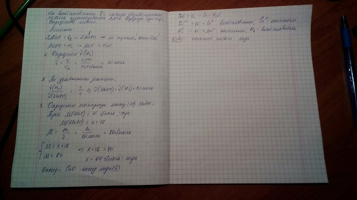На восстановление 8г оксида двухвалентного металла израсходовалось 2,24л водорода.Какой металл в этом оксиде? Составьте уравнение окислительно-восстановительной реакции,соответствующей данной схеме.