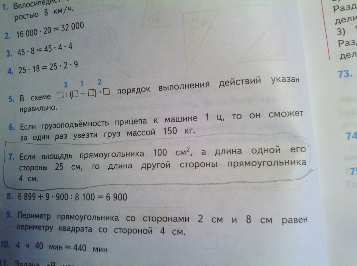 Если площадь прямоугольника 100 см2, а длина одной его стороны 25 см, то длина другой стороны прямоугольника 4 см?