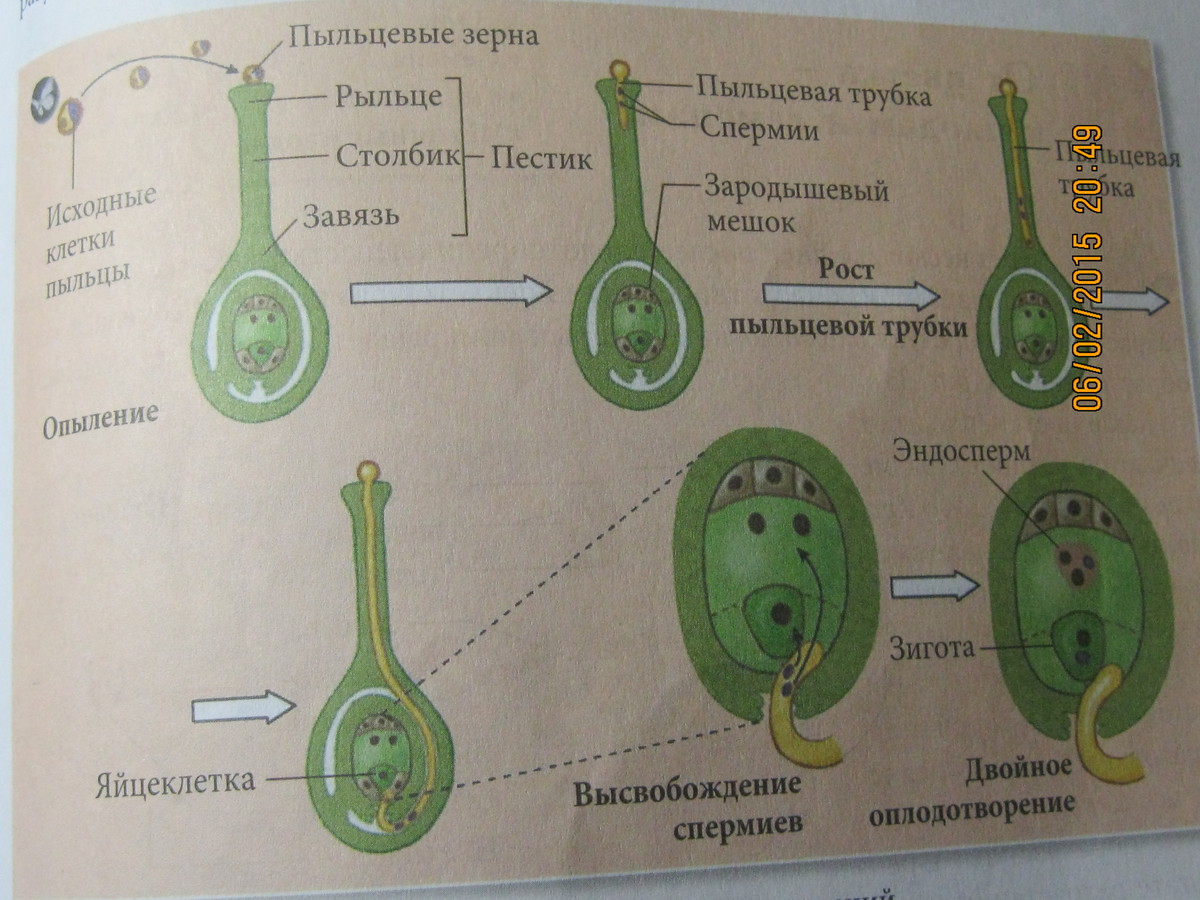 Пыльца попала на рыльце пестика в результате опыления, На рыльце пестика пыльца прорастает. Из большой клетки образуется длинная пыльцевая трубка, которая по тканям столбика дорастает до завязи и далее до семяпочки. Из маленькой клетки к этому моменту образуются два спермия, которые спускаются в пыльцевую трубку.Семяпочка одета особым покровом, в котором имеется небольшой канал —пыльцевход, в который и проникает пыльцевая трубка, несущая спермий. Внутри семяпочки развивается зародышевый мешок — образование, характерное только для цветковых растений . Пыльцевая трубка через пыльцевход семяпочки входит в зародышевый мешок, лопается, и один из спермиев сливается с
