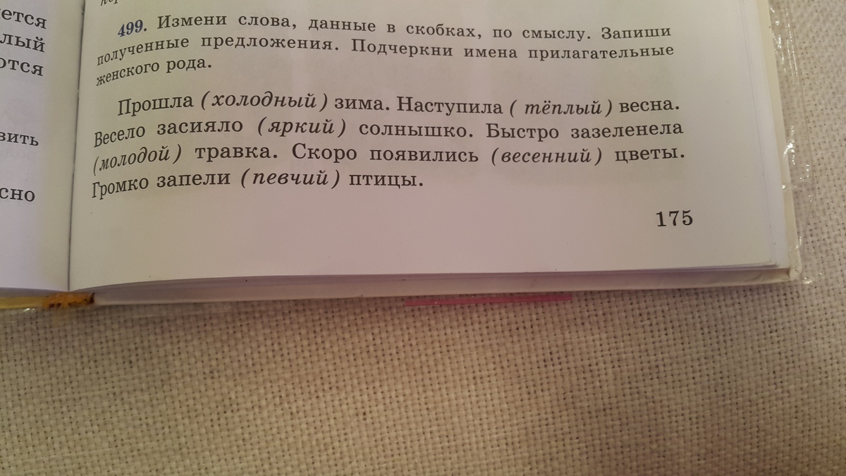 Прошла холодная (какая?) зима.. Наступила тёплая (какая?) весна. Быстро зазеленела молодая (какая?) трава. Скоро появились весенние (какие?) цветы. Громко запели певчие (какие?) птицы.