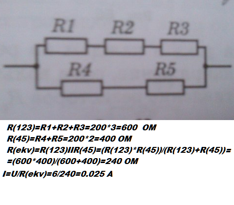 физика 8 класс найдите сопротивление цепи и силу тока в каждом из одинаковых резисторов сопротивлением по 200 ом. к цепи приложено напряжение 6 в.
