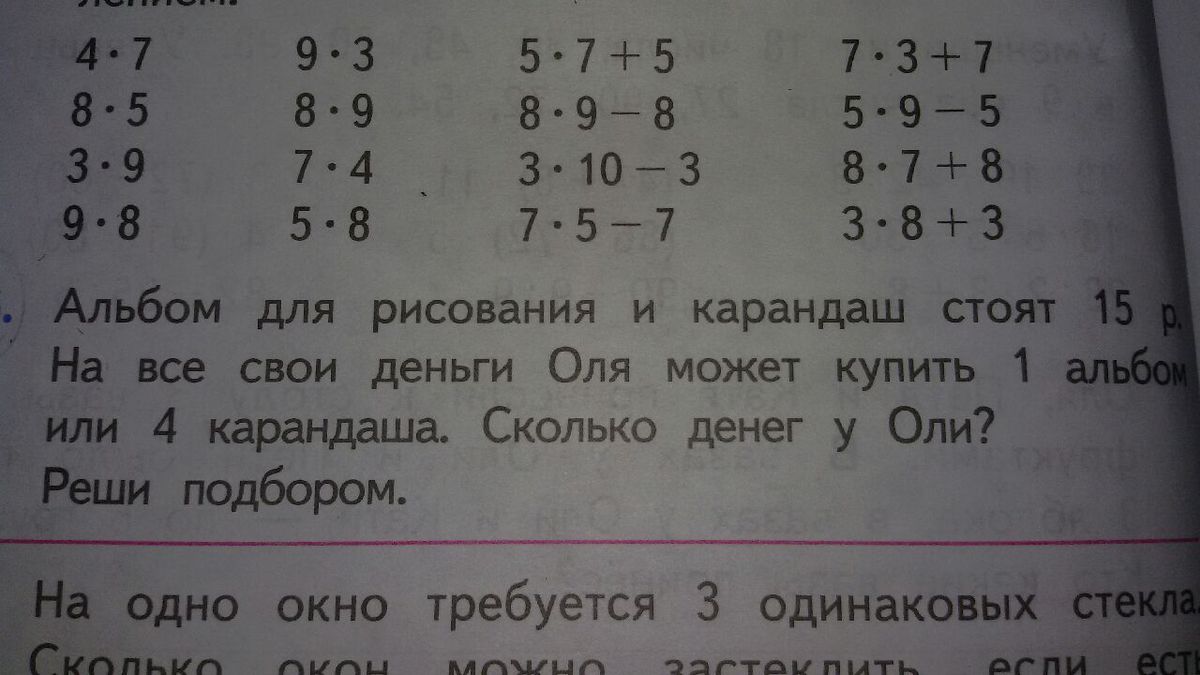 альбом может стоить 12 рублей, тогда 1 карандаш 3 рубля (если 3*4=12) то всего денег 12 рублей у Оли.