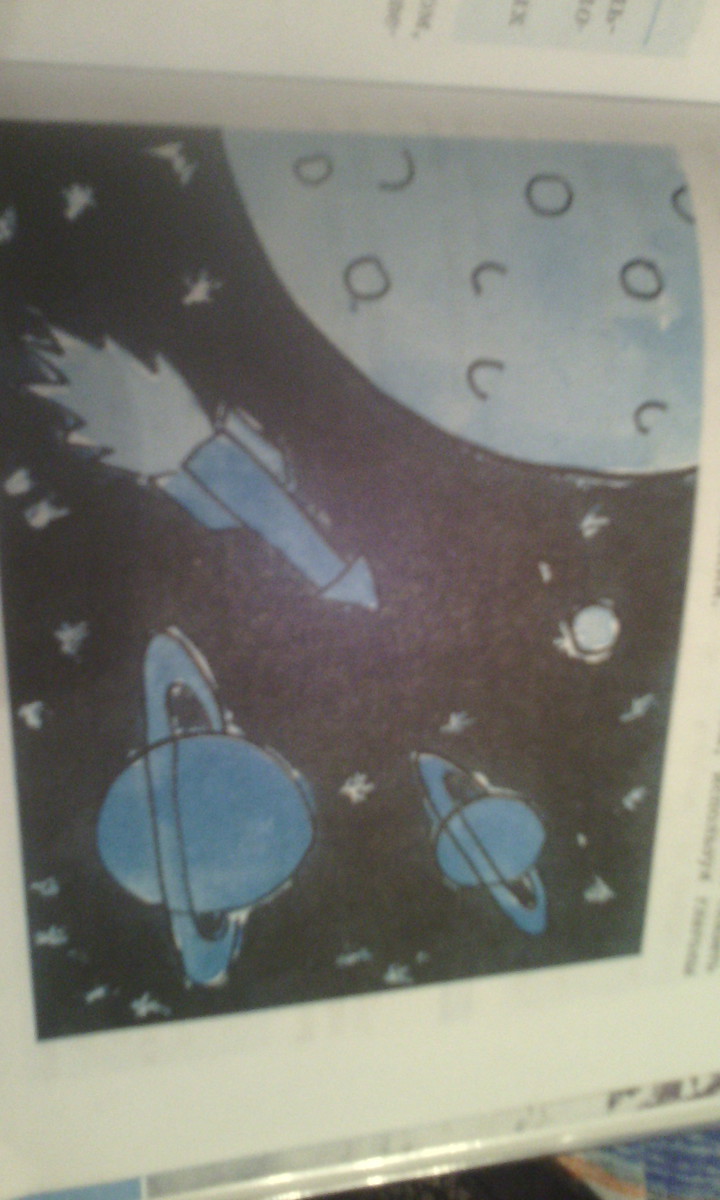 На этой картине ( если известен автор, можешь написать: "На картине Иванова(например)..." мы видим космос, звезды, планеты и луну. Так же там летает ракета.