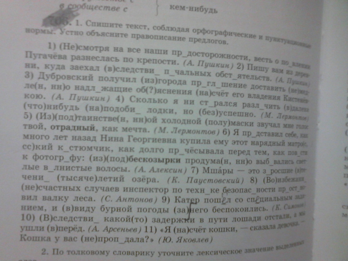 1) Несмотря на все наши предосторожности, весть о появлении Пугачева разнеслась по крепости. 2) Пишу к вам из деревни, куда заехал вследствие печальных обстоятельств. 3) Дубровский получил из города приглашение доставить немедленно надлежащие объяснения насчет его владения Кистенёвкою. 4) Сколько я ни старался различить вдалеке что-нибудь наподобие лодки, но безуспешно. 5) Из-под таинственной, холодной полумаски, звучал мне голос твой отрадный, как мечта. 6) Я представил себе, как много лет назад Нина Георгиевна купила ему этот нарядный матросский костюмчик, как долго причесывала перед тем, как повести к фотографу: из-под бескозырки продуманно выбивались светлые волнистые волосы. 7) Мшары - это заросшие в течение тысячелетий озёра. 8) Во избежание несчастных случаев инспектор по технике безопасности приостановил валу леса. 9) Катер пошел со специальным заданием, и ввиду бурной погоды за него беспокоились. 10) Вследствие какой-то задержки, в пути лошади отстали, а мы ушли вперед. 11) "Я насчет кошки, - сказала девочка. - Кошка у вас не пропадала?"