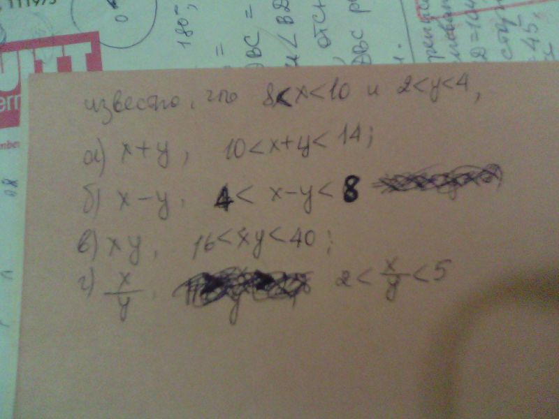 Известно что 8<x<10 и 2<y<4. Оцените значения выражения а) x+y; б)x-y; в)xy; г) x/y . Помогите, буду очень благодарен!.