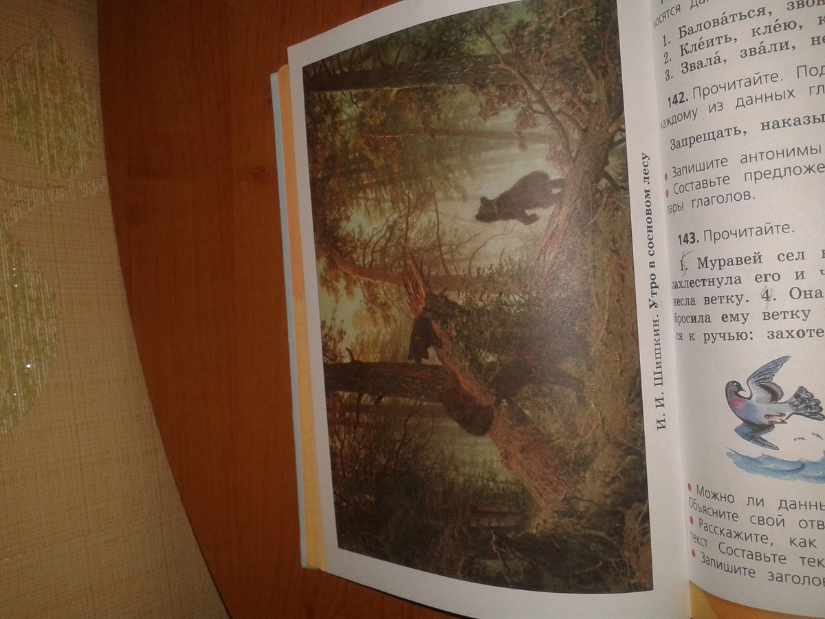 Утро.Просыпается сосновый лес.Вышли на прогулку мама-медведица и три её медвежонка.Младший залез на дерево и застрял,а средний помогал и тоже застрял.Старший смотрел на сосновый лес,а в это время мама-медведица помогала двум своим медвежонкам