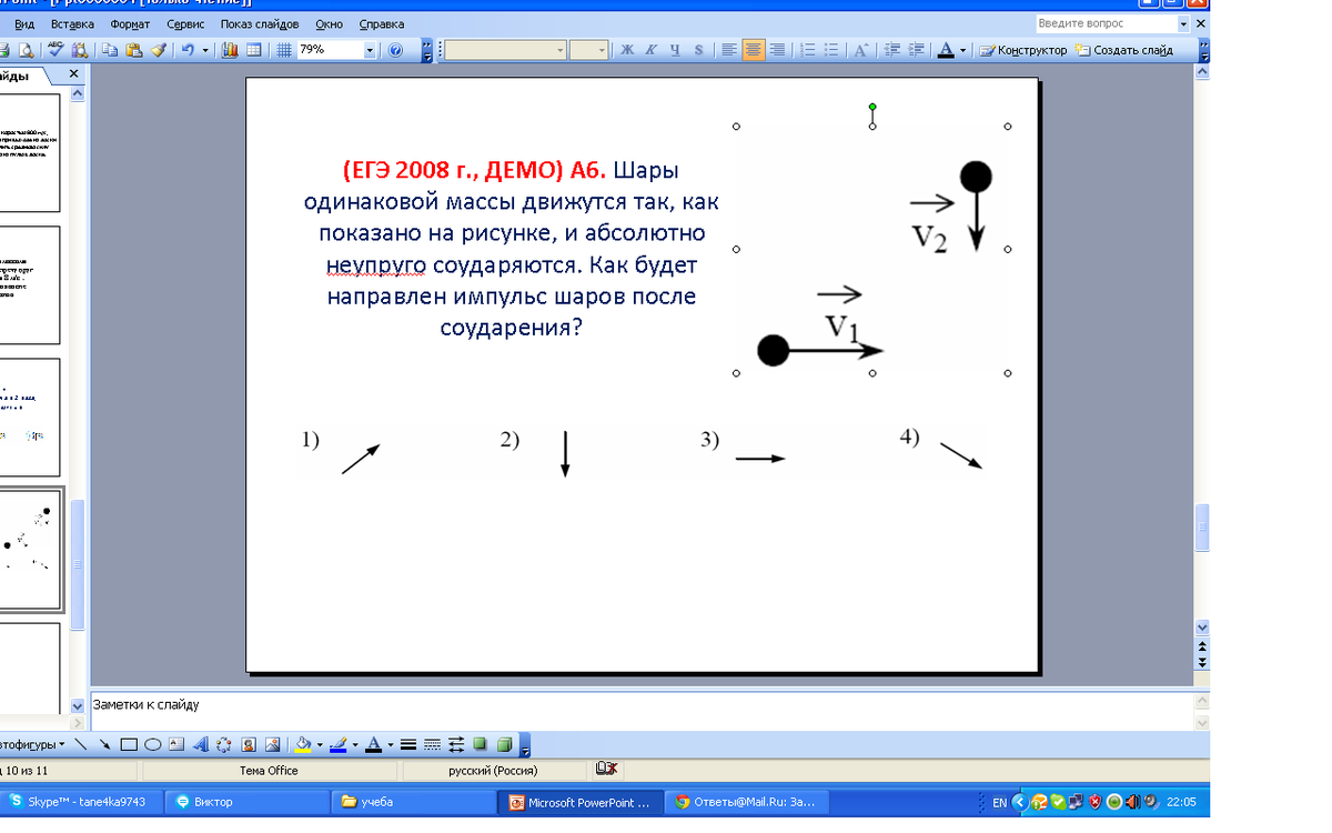 Шары одинаковой массы движутся так, как показано на рисунке, и абсолютно неупруго соударяются. Как будет направлен импульс шаров после соударения?