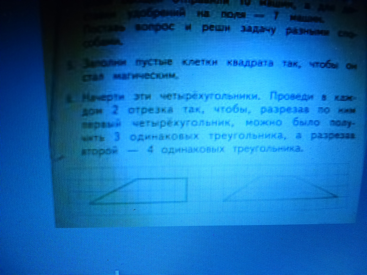 Это задание дано в учебнике с ошибкой - из второго 4-угольника никак не получить 4 одинаковых треугольника (правая часть больше). Можно просто получить 4 треугольника (см. рис.).