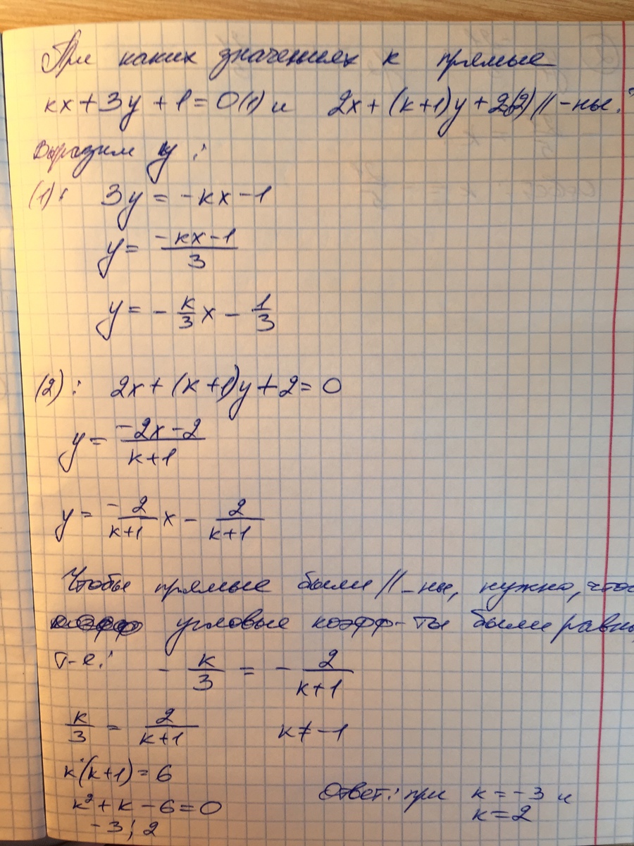 При каких значения k прямые kx+3y+1=0 и 2x+(k+1)y+2=0 параллельны?
