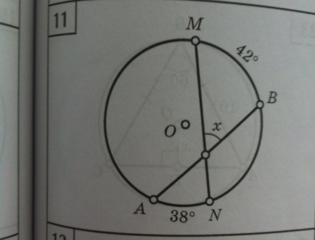 Внутренний угол относительно окружности равен полусумме дуг, которые высекают в окружности стороны угла и их продолжения за вершину угла, значит искомый x=1/2(38+42)=80/2=40 градусов.