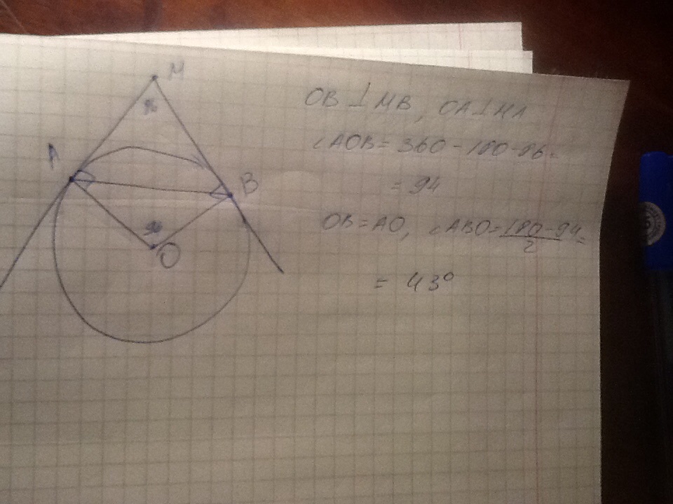 Касательные в точках а и в к окружности с центром о пересекаются под углом 86 градусов найти угол аво ответ дайте в градусах.Решит желательно на бумаге