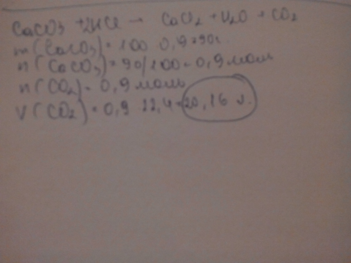 определите объем углекислого газа (н.у.), выделившегося при взаимодействии 100 г известняка, содержащегося 90% карбоната кальция, с соляной кислотой.