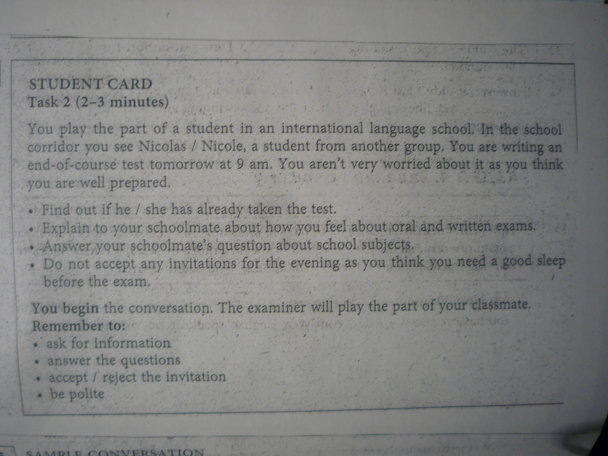 Student Of course, I do but I’m sorry I can’t. I must sleep well before my exams and be full of energy.