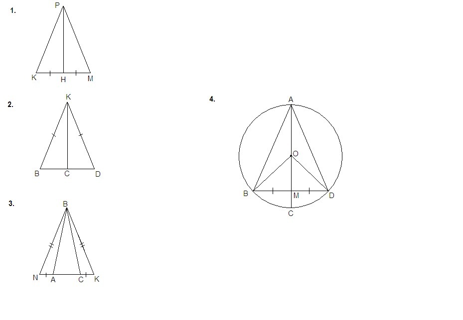 1Сторона РК и РМ треугольника РМК равны, PN его медиана. Найдите углы PHK и KPH, если угол МРК= 42 градуса 2Луч КС биссектриса угла DBK, а отрезок DK равен отрезку BK.Докажите, что треугольник KDC=треугольнику KBC 3 На основании NK равнобедренного треугольника NBK отложены отрезки NA=KC.Докажите что угол NBA=углу KBC 4В окружности с центром О проведены диаметры АС и хорда ВD, пересекающиеся в точке М, причем ВМ=DМ. угол ВАС=35 градусам. найдите угол ВАD