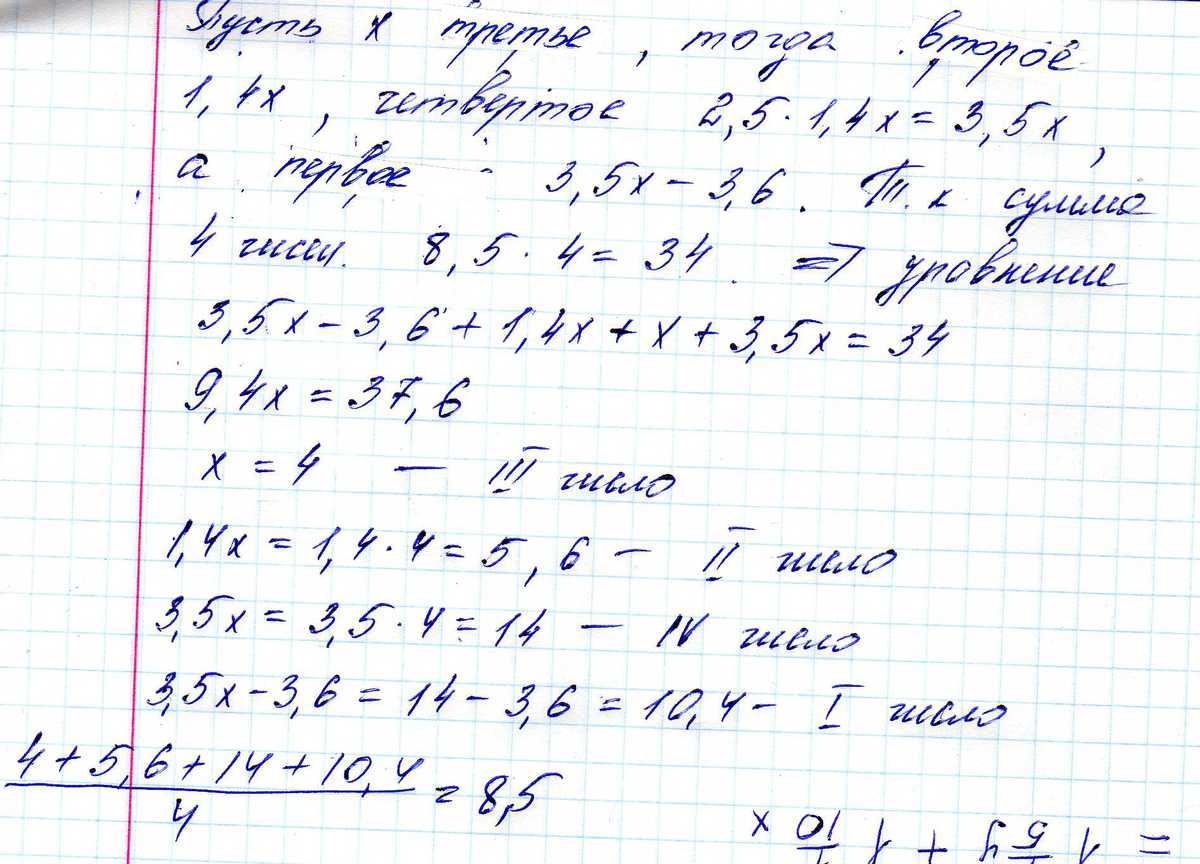 как решить задачу? среднее арифметическое четырех чисел равно 8,5.первое число меньше четвертого на 3,6. третье число меньше второго в 1,4 раза,четвертое больше второго в 2,5 раза.найдите эти числа.