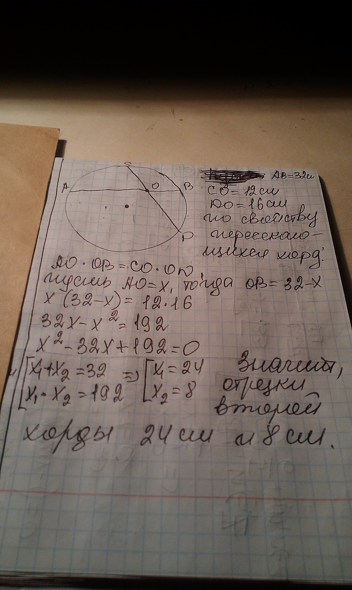 1. Одна из двух пересекающихся хорд окружности равна 32 см, а отрезки другой хорды равны 12 см и 16 см. Найдите отрезки первой хорды.
