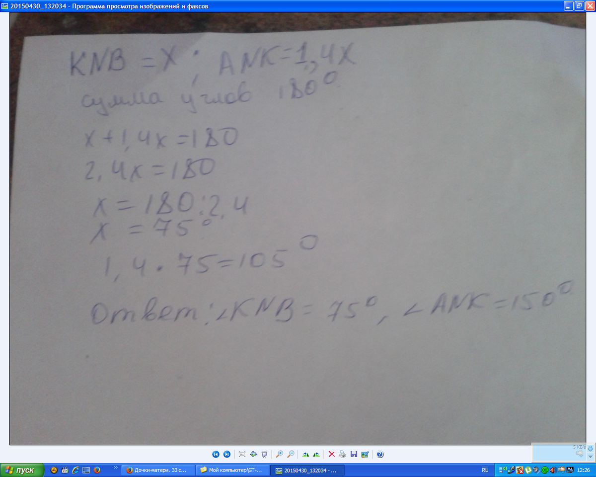Луч NK делит развёрнутый угол ANB на два угла ANK и KNB .Найдите градусную меру этих углов , если ANK больше KNB в1,4 раза