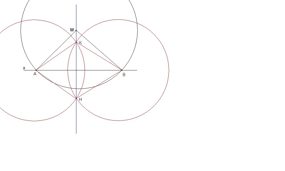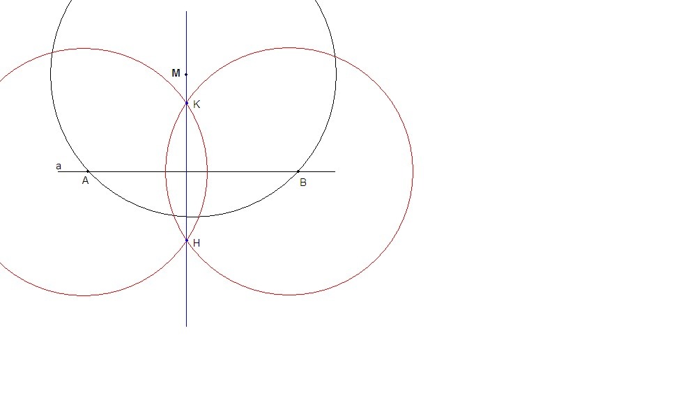 МА = МВ как равные радиусы черной окружности, значит и точка М лежит на прямой КН, т.е. перпендикуляр к прямой а проходит через точку М.