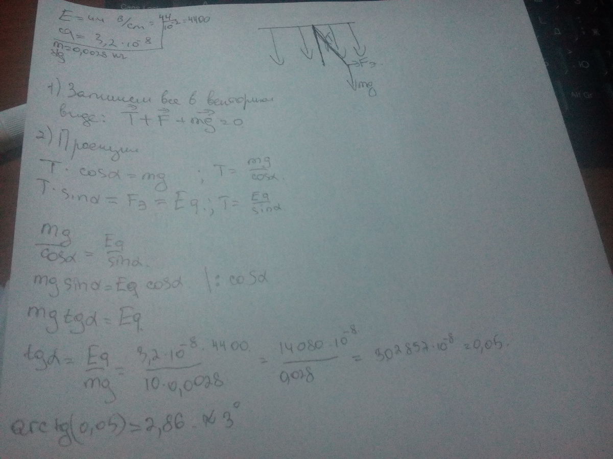 Какой угол с вертикалью составляет нить, на которой висит заряженный шарик массой 2,8 г, помещенный в горизонтальное однородное электростатическое поле напряженностью 44 В/см? заряд шарика 3,2*10(-8) Кл