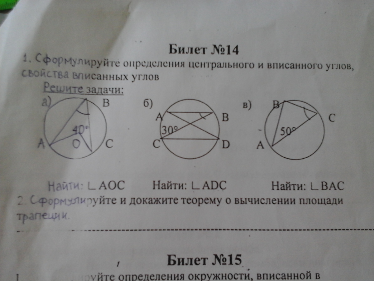 в) <BAC=90-50=40 град ( так как угол АВС=90 град, как угол опирающийся на диаметр, то сумма двух других углов =90)
