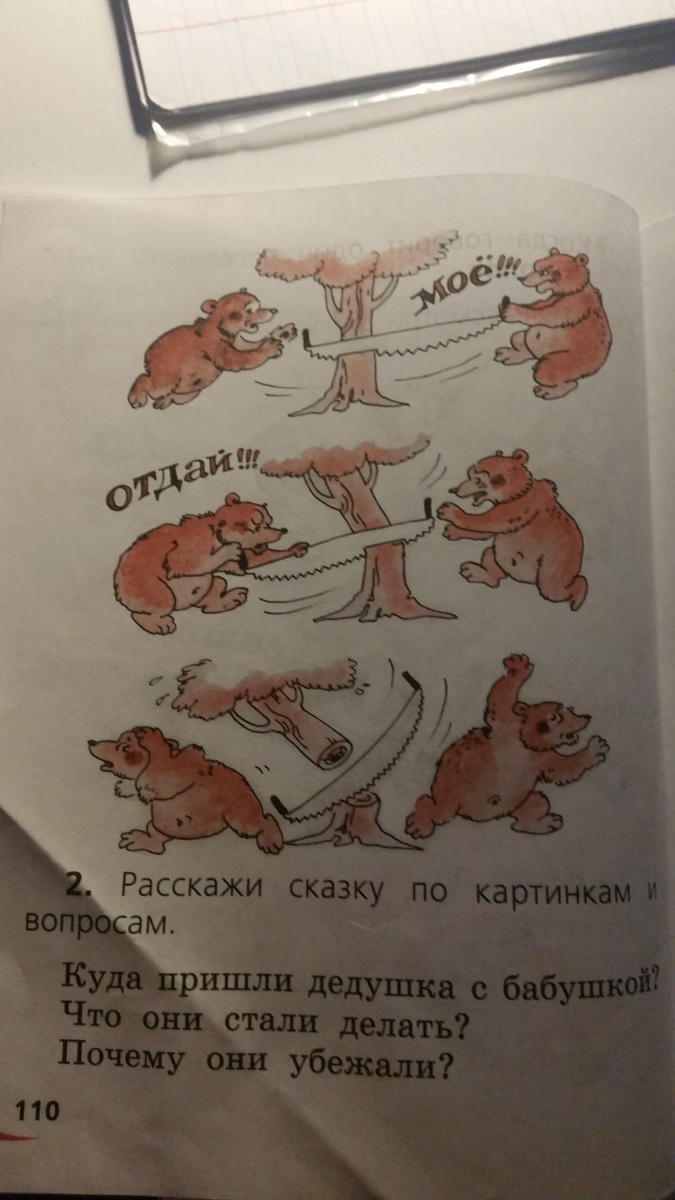 Дед с бабкой решили истопить баню...Но у них не было дров...И задумали они пойти в лес и напилить их...Идут идут....Вдруг видят деревце.Дед говорит: давай бабка спилим его.На том и решили.Пилят пилят..А рядом берлога медведей..Медведи увидели бабку с дедом и подумали ,что они хотят мёда из дерева добыть...Подбежали ,рявкнули на них ...Дед с бабкой и убежали.Медведи стали пилить дерево...Один стал думать что все заберут мёд и не дадут ему..И стал он стал тянуть пилу на себя.Та дак тянул что дерево упало..Медведи и убежали.Так ничего никому и не досталось.