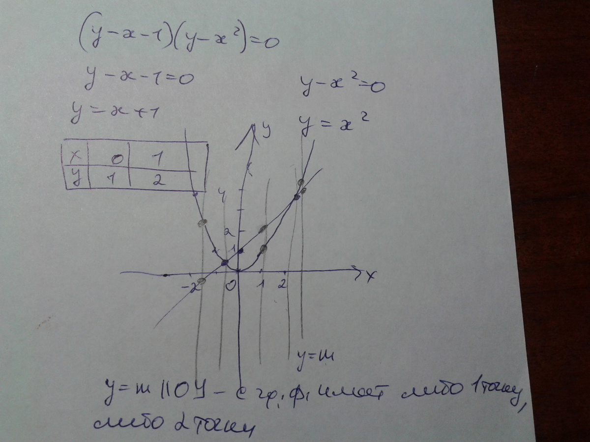 построить график уравнения (у-х-1)(у-х^2)=0 Сколько точек пересечения имеет график данного уравнения с прямой, параллельной оси ординат?»
