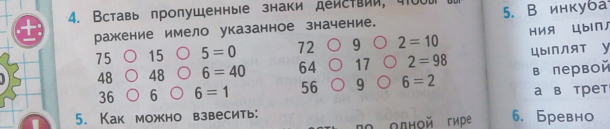 Вставь пропущенные знаки действий,чтобы выражение имело указанное значение.