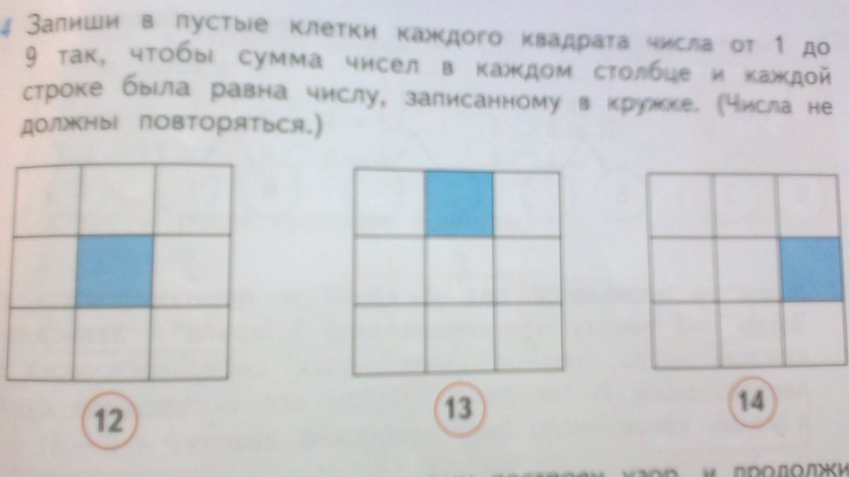 1 класс перспектива,часть 2,2015 год страница 81 задача 4:запиши в пустые клетки каждого квадрата числа от 1 до 9 так,чтобы сумма чисел в каждом столбце и каждой строке была равна числу,записанному в кружке.(числа не должны повторяться)