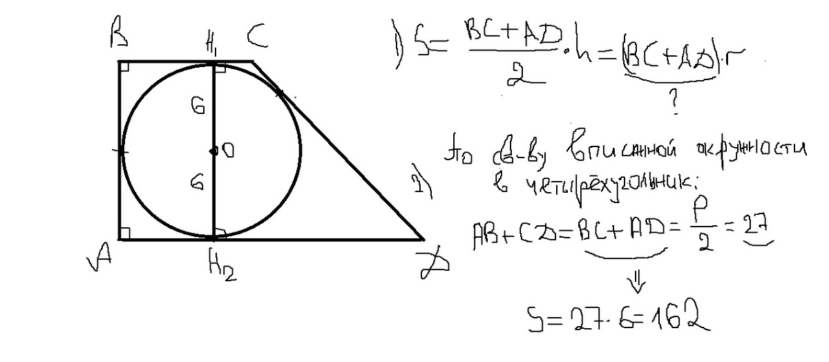 Около окружности описана прямоугольная трапеция. Найдите стороны трапеции, если ее периметр равен 54 см, а радиус окружности 6 см