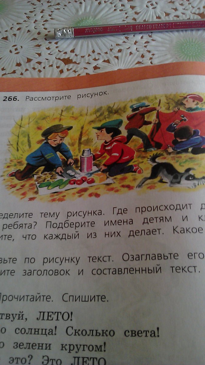 Физрук равзвел костер и девочки поставили котелок с крупой петрушкой и консервами. Учительница помогала варить суп. Петя вызвался помочь маше сделать салаты. Коля Ваня и Радик ставили палатки.