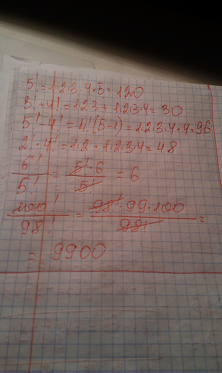найдите значение выражения 1)5! 2)3!+4! 3)5!-4! 4)2!*4! 5)6!/5! 6)100!/98!