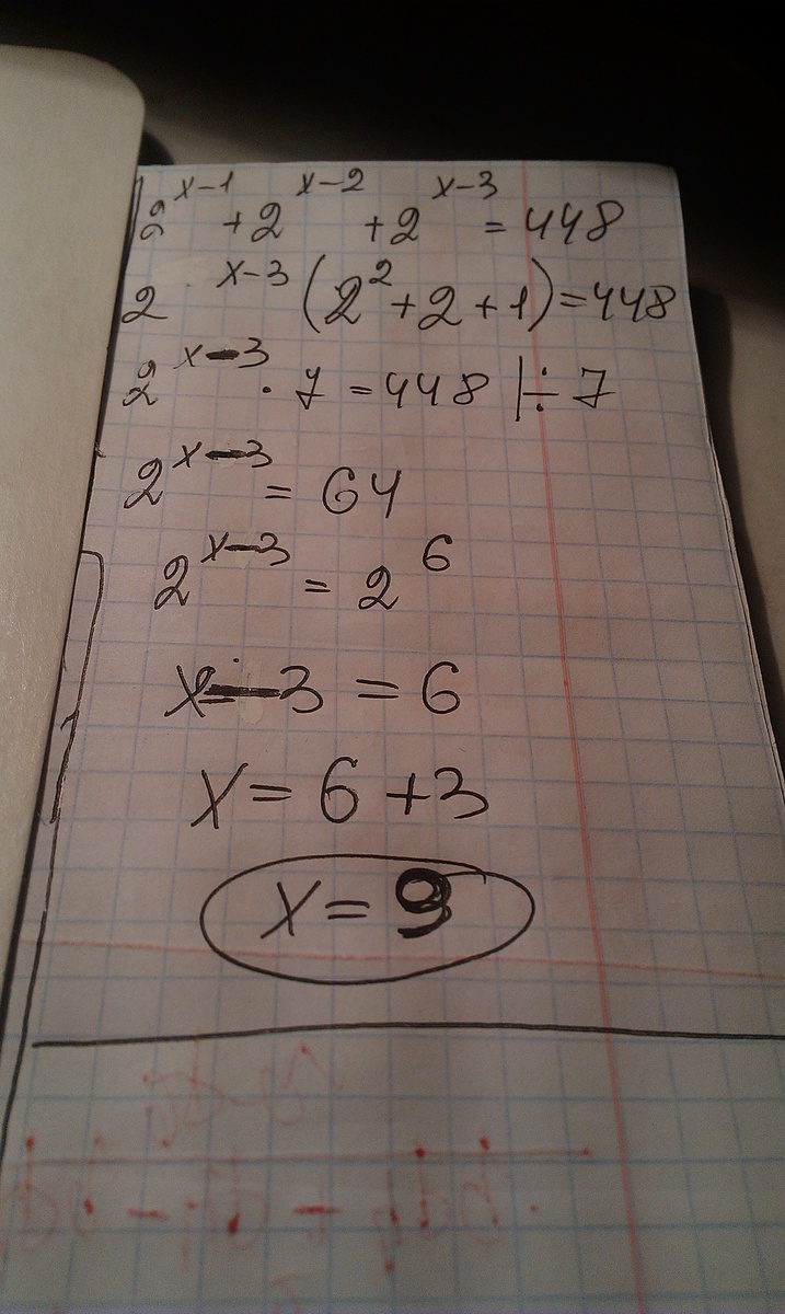 2^(x-1)+2^(x-2)+2^(x-3)=448
