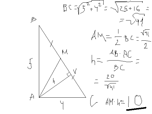 В прямоугольном треугольнике с катетами 4 и 5 провели медиану и высоту и вершины прямого угла. Чему равно произведение их длин? Кто решит, то ответ отмечу как лучший)