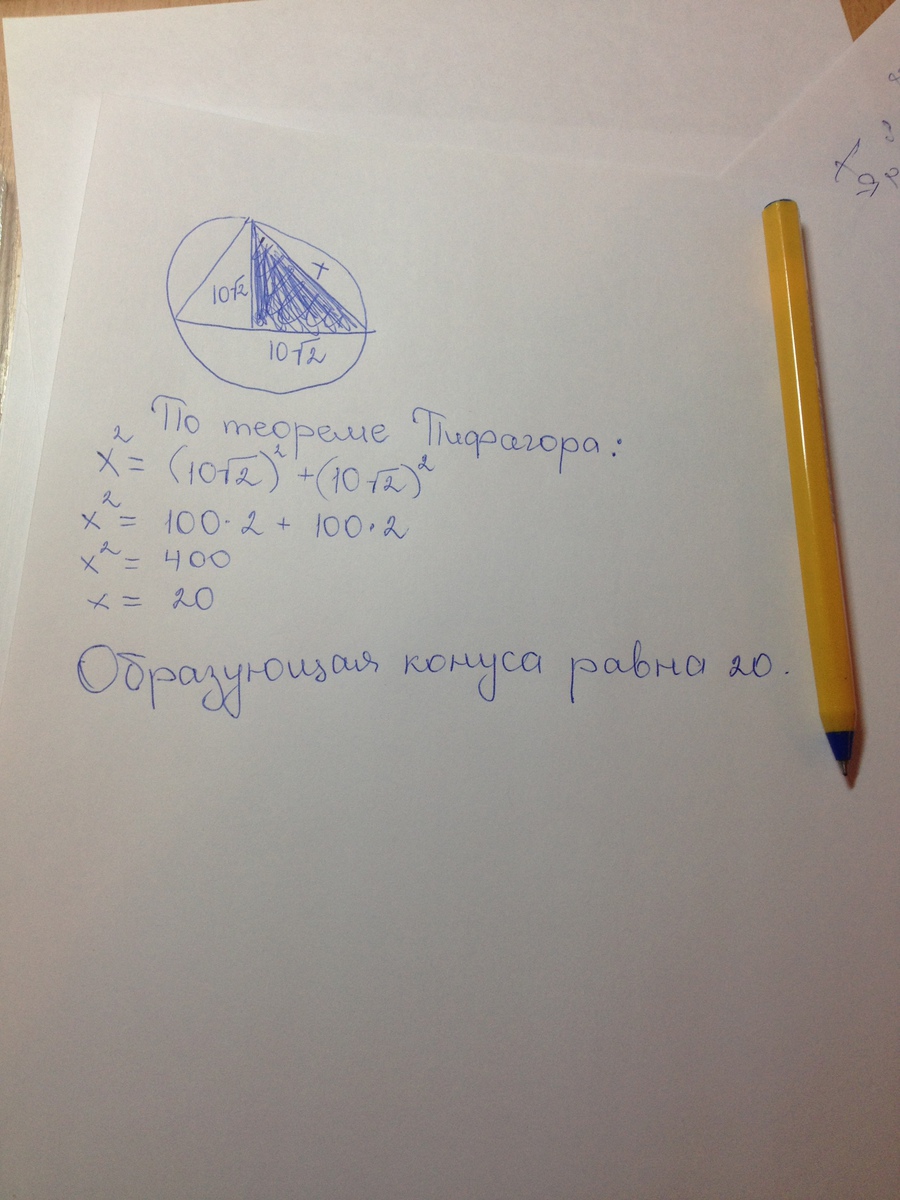 Около конуса описана сфера (сфера содержит окружность основания конуса и его вершину). Центр сферы совпадает с центром основания конуса. Радиус сферы равен 102√. Найдите образующую конуса.
