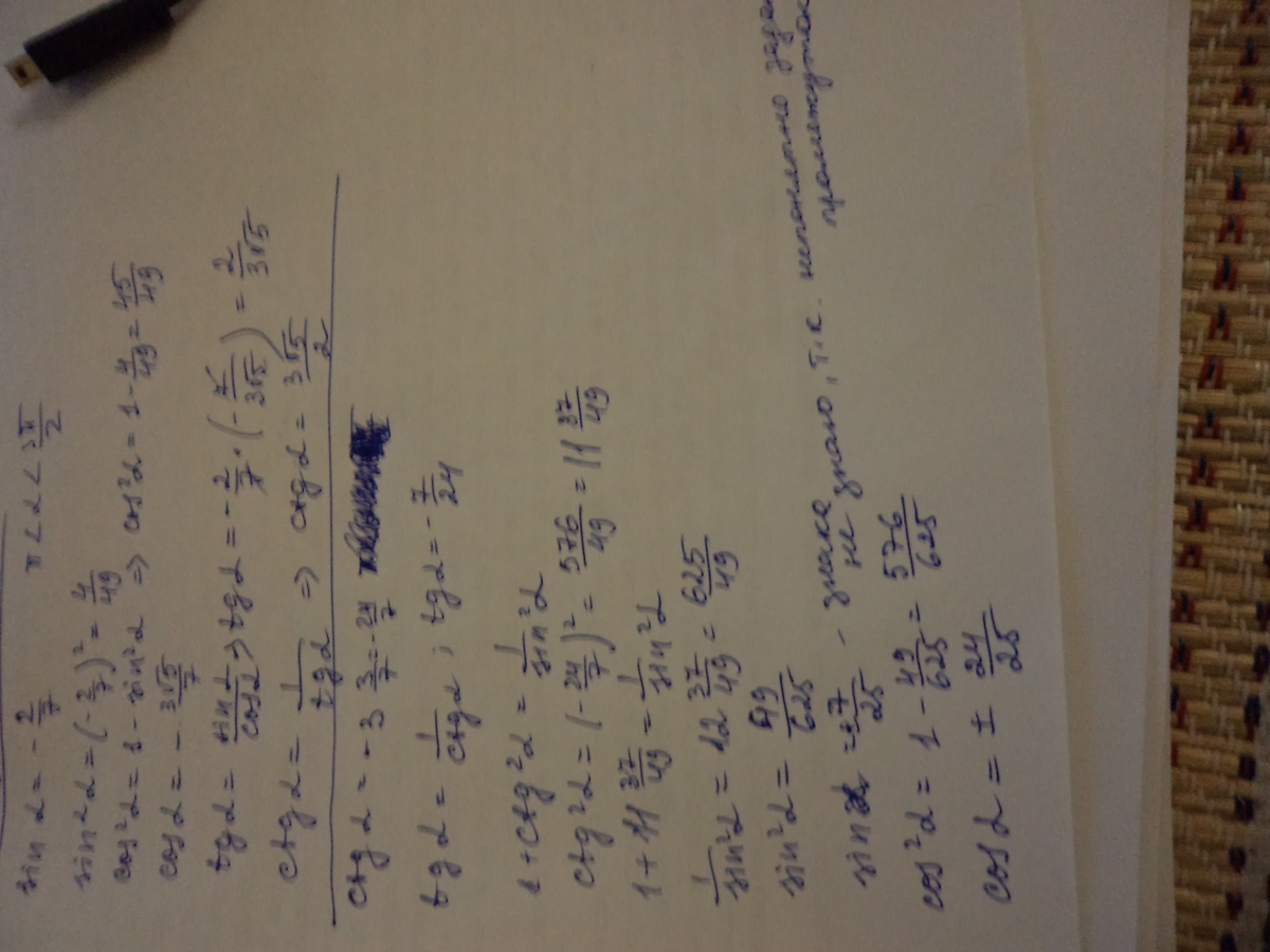 sin a = -2/7, пи< a > 3пи/2 Найдите значения cos a, tg a, ctg a