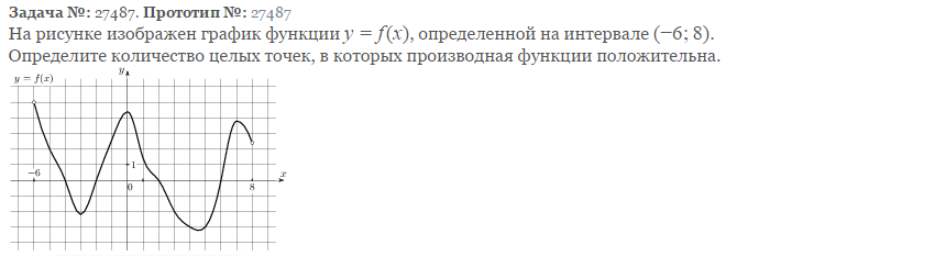 Производная функции положительна на интервалах, на которых функция возрастает, то есть на интервалах (−3; 0), (4,2;6,9). В них содержатся целые точки −2, −1, 5 и 6 Получили 4 точки.