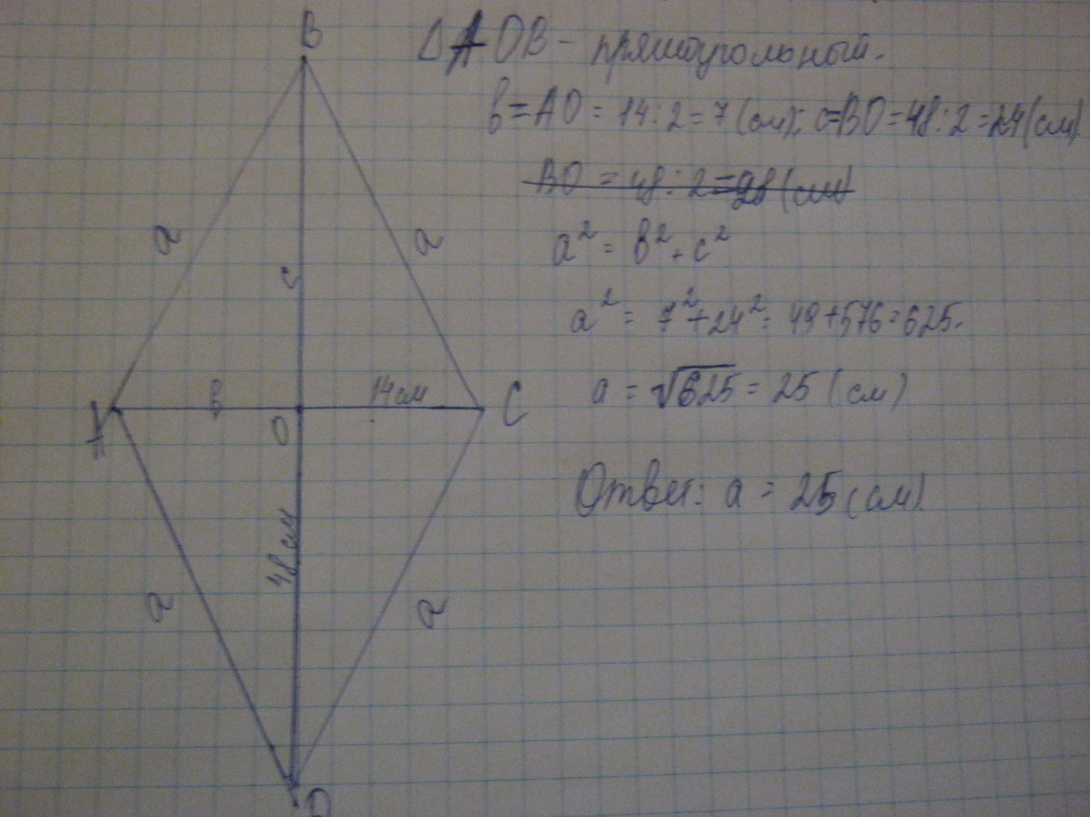 Диагонали ромба равны 14 и 48 см. Найдите сторону ромба