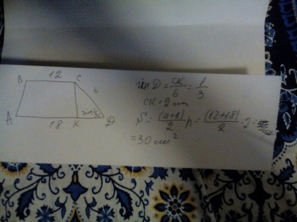 Основания трапеции равны 18 и 12, одна из боковых сторон равна 6, а синус угла между ней и одним из оснований равен 1\3. Найдите площадь трапеции