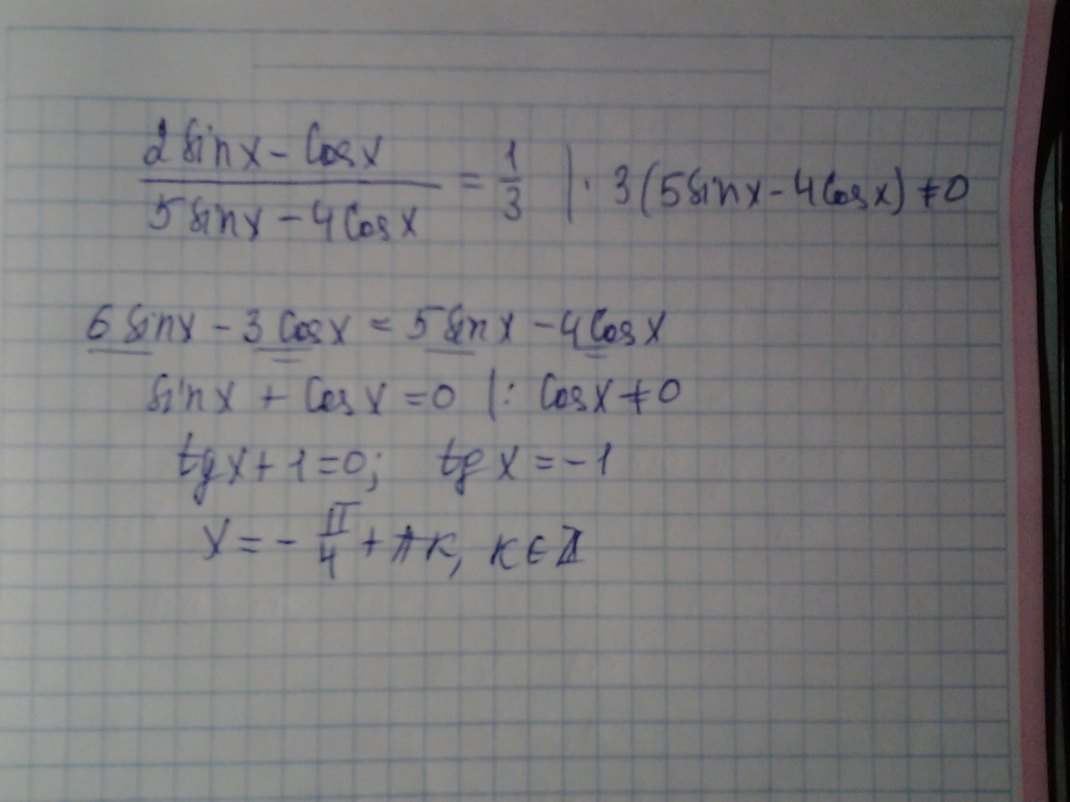 (2 sin x - cos x) : (5 sin x - 4cos x) = 1:3 принадлежащие отрезку [pi:2 ; pi:2]