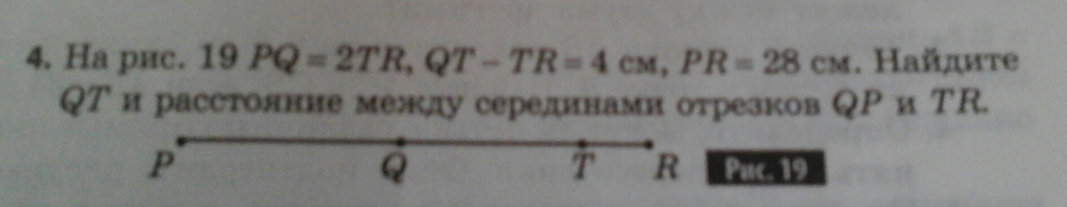 Пусть TR=x, тогда PQ=2x и QT=4+x. Сумма всех отрезков равна 28, значит: