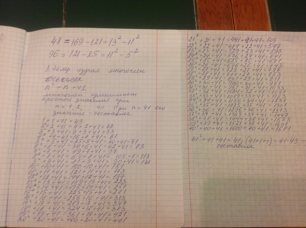 2. Леонард Эйлер предложил такую формулу простых чисел: р=n^2-n+41. Сколько простых чисел даёт эту формула при подстановке в неё последовательных натуральных чисел, начиная с 1? Выполните вычисления до получения первого составного числа.