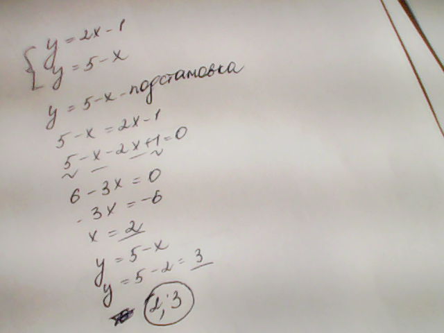 Пожалуйста! Очень срочно!Найдите точку пересечения графиков функций y=2x-1 и y=5-x.