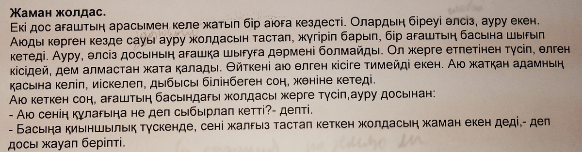 Два друга шли между деревьями и встретели одного медведя.Один был безсилы другой болен.Больной увидев медведя один бросив друга залезал на дерево .А другой который без силы не модет на дерево залезть как его друг.Он нагнулся вниз и притворялся мертвым не дыша.Потому что медведь не трогает того кто мертвый.Медведь понюхав звука не услышав ушел.После ухода медведя ,приятель который сидел на дереве спустился вниз спрашивает у друга;