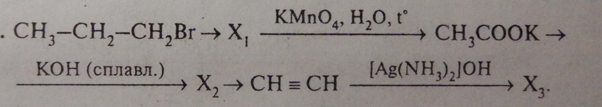 1)CH3-CH2-CH2Br+KOH(спирт.) =CH3-CH=CH2+KBr+H2O