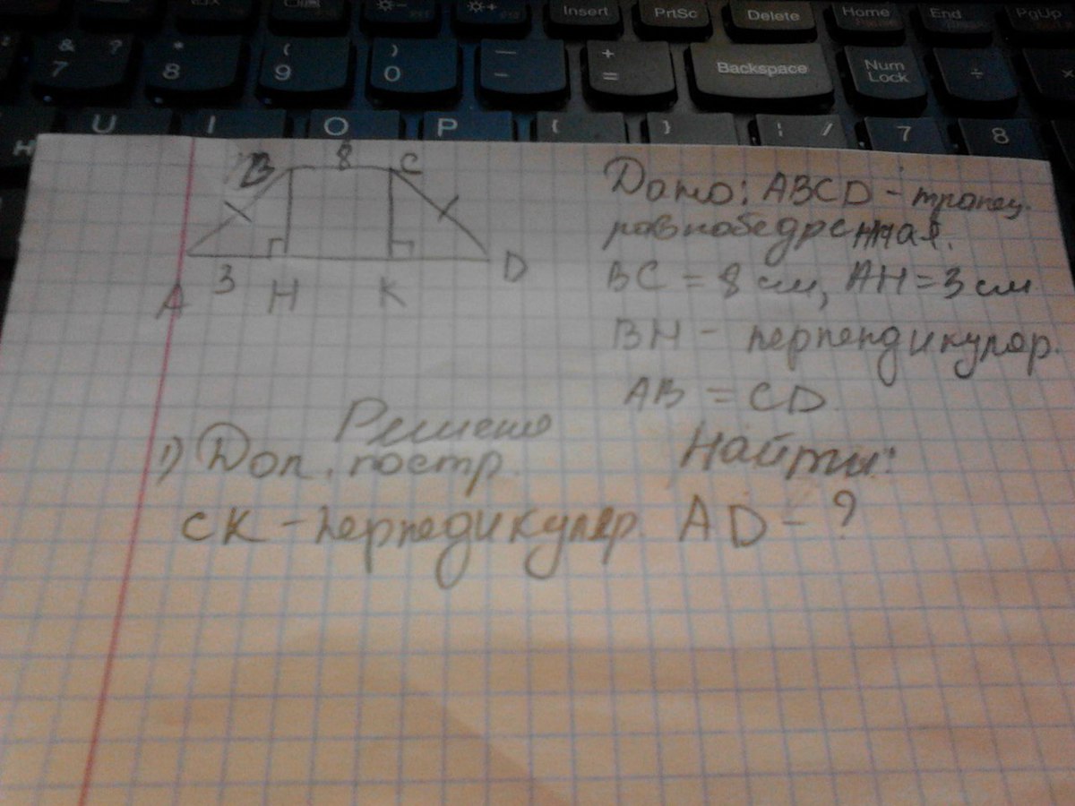 1)Дана трапеция ABCD - равнобедренная,BH-перпендикулярно AD , BC = 8 см, AH = 3 см. Найти сторону AD.
