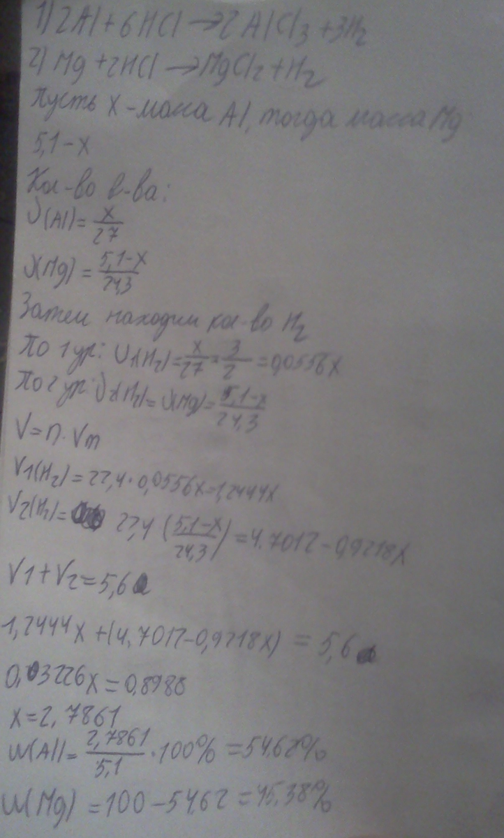 При растворение 5,1 г сплава магния и алюминия в соляной кислоте выделилось 5,6 л водорода, определите массовую долю сплава.