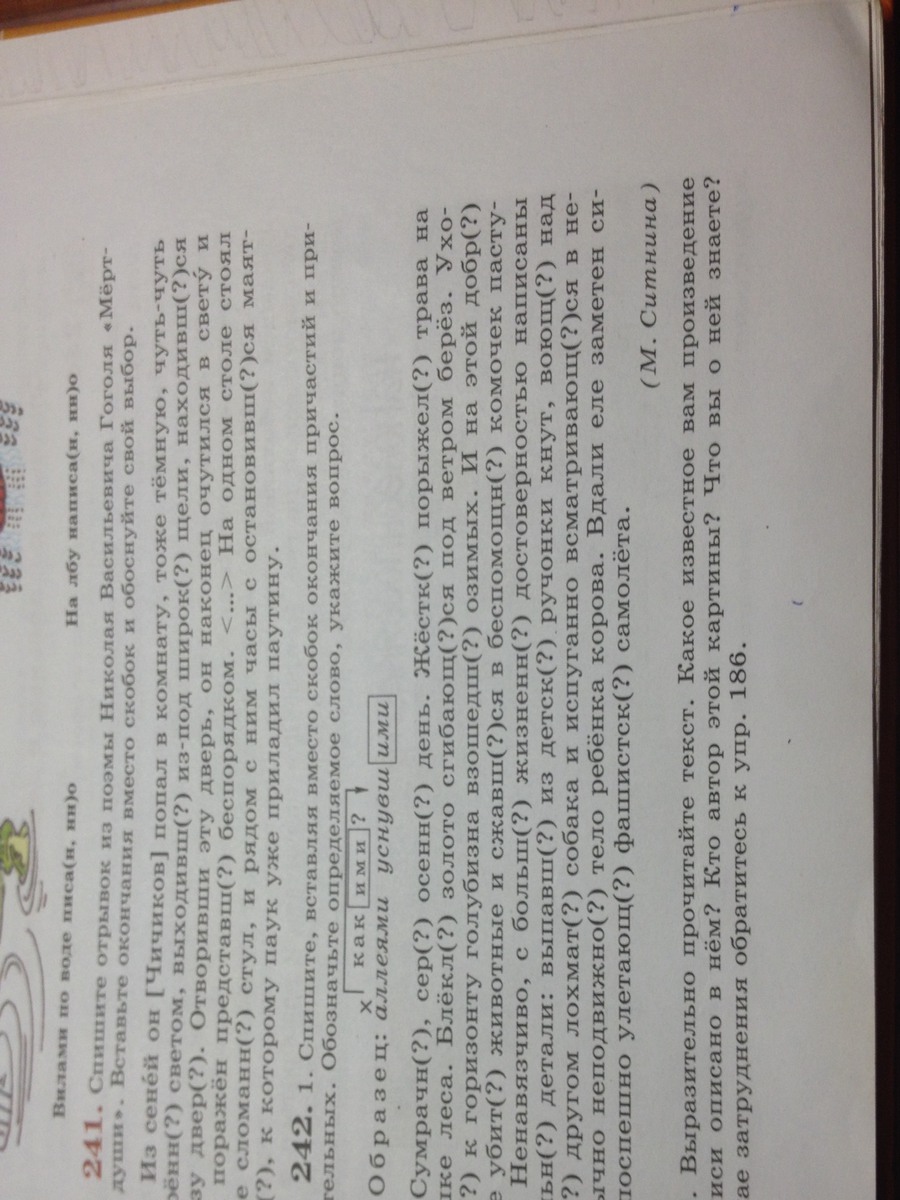 Сумрачн(?),сер(?) осннн(?) день.Жёстк(?) порыжел(?) трава на опушке леса.Блёкл(?) золото сгибающ(?)ся под ветром берёз.Уходящ(?) к горизонту голубизна взошедш(?) озимых.И на этой добр(?) земле убит(?) животные и сжавш(?)ся в беспомощн(?) комочек пастушок.Ненавязчиво,с больш(?) жизненн(?) достоверностью написаны отдельн(?) детали:выпавш(?) из детск(?) ручонки кнут,воющ(?) над убит(?) другом лохмат(?) собака и испуганно всматривающ(?)ся в непривычно неподвижно(?) тело ребёнка корова.