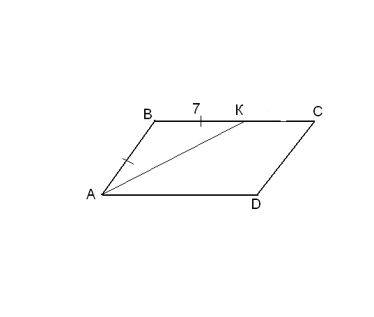 Биссектриса угла параллелограмма отсекает равнобедренный треугольник. АВ=ВК= 7 ед.