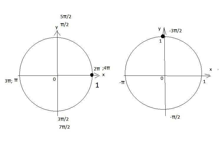 найти координаты точки единичной окружности.полученной поворотом точки (1;0) на угол: 4п(пи), -(3/2)п